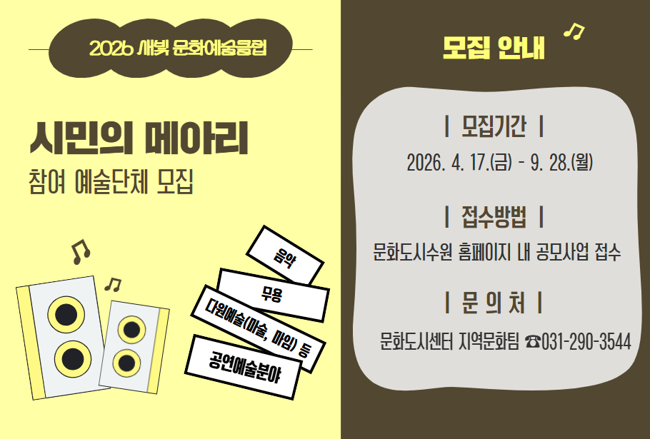 2026 새빛 문화예술클럽 <시민의 메아리> 참여 예술단체 모집2026 로컬콘텐츠 창제작 지원사업 참여자 모집