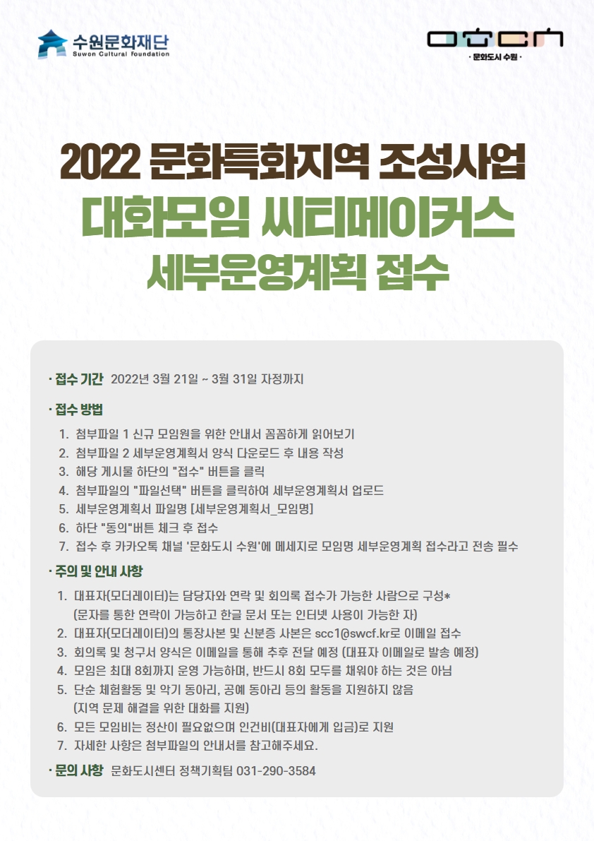 공모 내용 표 제목 [대화모임 씨티메이커스] 신규 모임 세부운영계획서 제출 접수기간 2022-03-21 ~ 2022-03-31 등록일 2022-03-21 첨부파일 첨부파일 1. 대화모임 씨티메이커스 신규 참여자를 위한 안내문.pdf 첨부파일 2. 2022년 대화모임 씨티메이커스 신규 모임 세부운영계획서 양식.hwp 목록