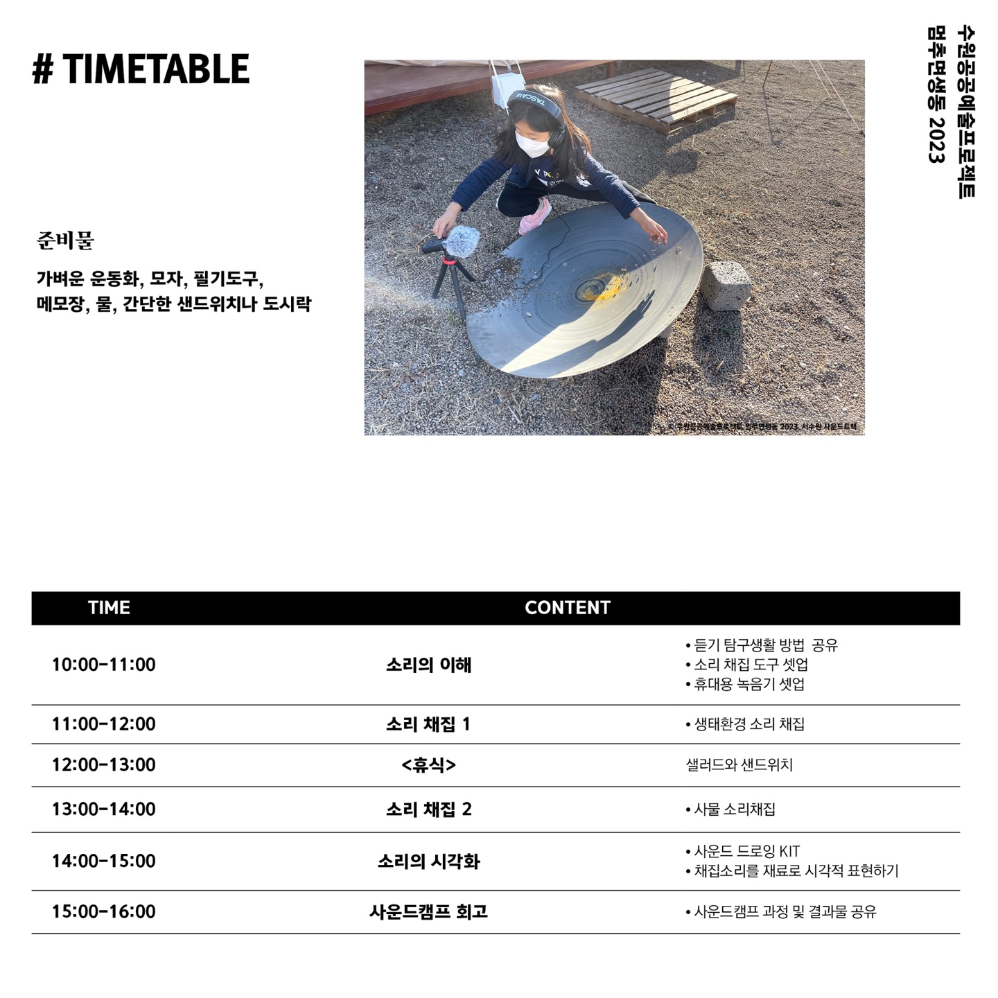 서수원 일대의 소리 환경을 관찰하고 탐구하는 청각 생태 활동으로, 곤충채집 하듯 서수원 주변 환경의 소리를 채집 기록합니다. 채집 기록된 소리를 매개로 사람, 도시환경 사이의 소리들의 관계성을 사유합니다. 채집된 소리를 재료로 시각적 표현과 그려진 그림에 손을 대면 소리가 들리는 사운드액자를 만드는 활동 입니다.