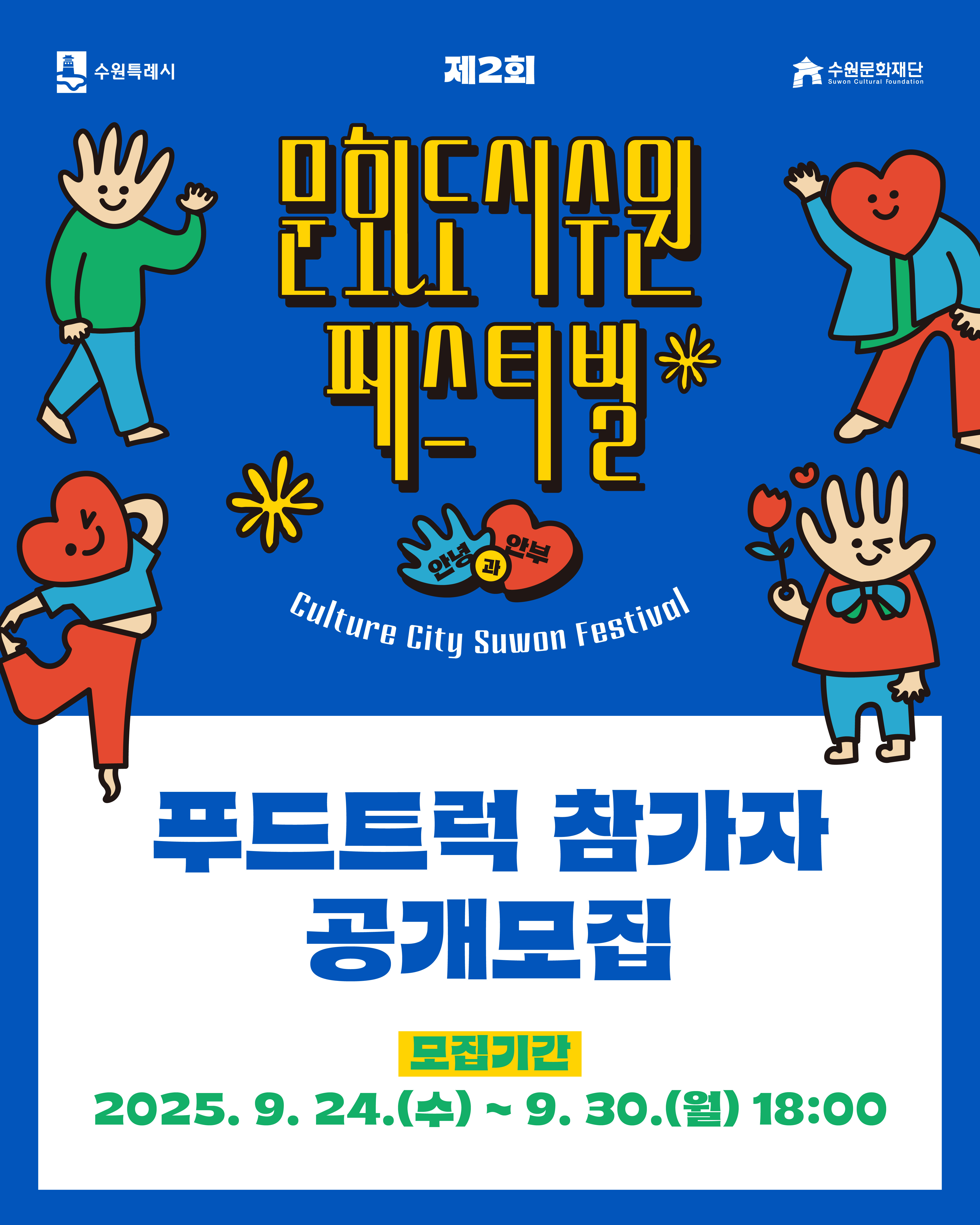 공지사항 +선택됨 행사 교육 공모사업 공지사항 + 공지 제2회 문화도시 수원 페스티벌 ‘안녕’ 후기 이벤트 공지 제2회 문화도시 수원 페스티벌 푸드트럭 참가자 공개모집 공지 제2회 문화도시 수원 페스티벌 푸드트럭 참가자 공개모집 공지 2025 수원은학교 <1인 1악기 학교> 강사 인력풀 모집 최종 합격자 발표 공고 행사 교육 교육 2025 수원은학교 [1인 1악기 학교] 2025.09.01 ~ 2025.11.30 공모사업